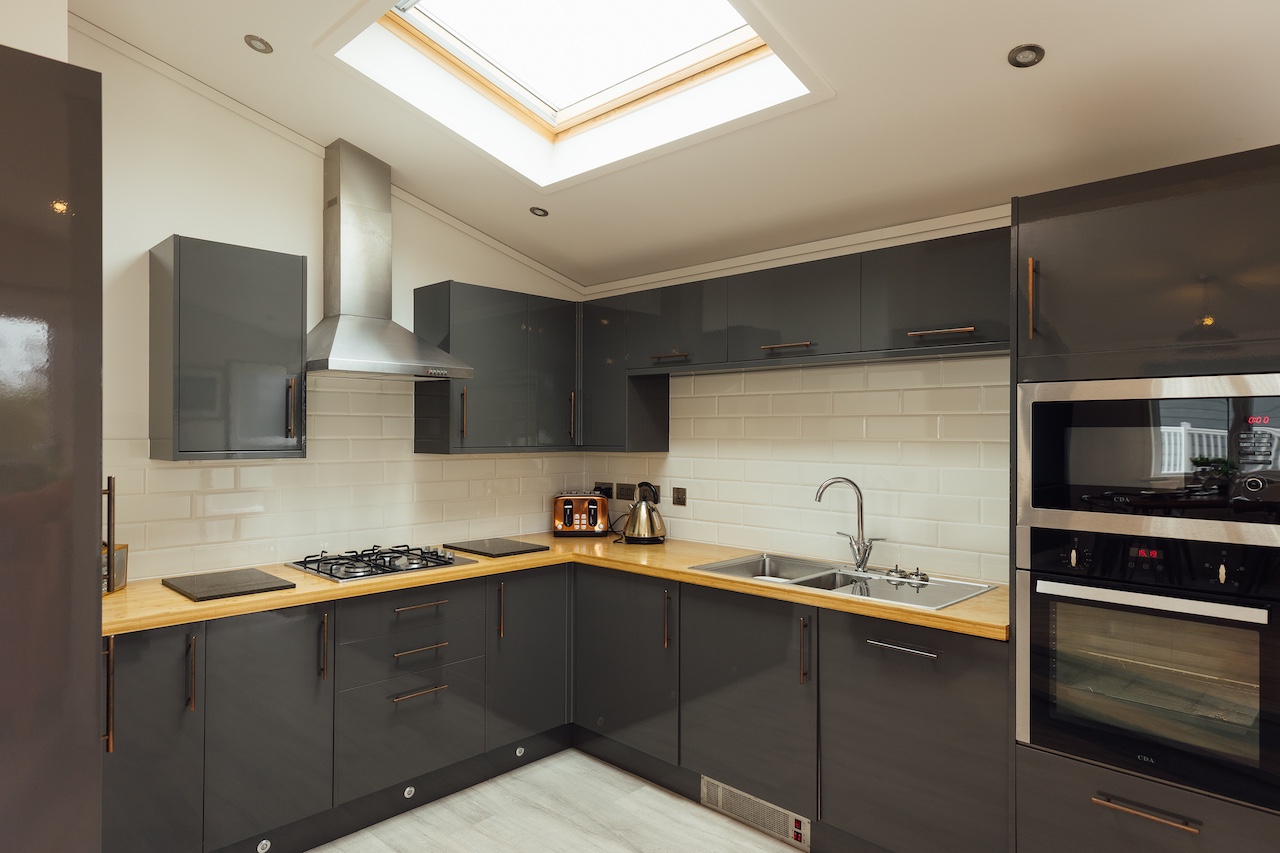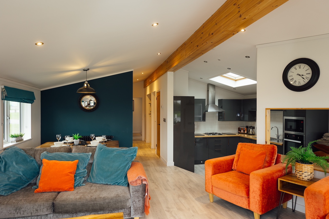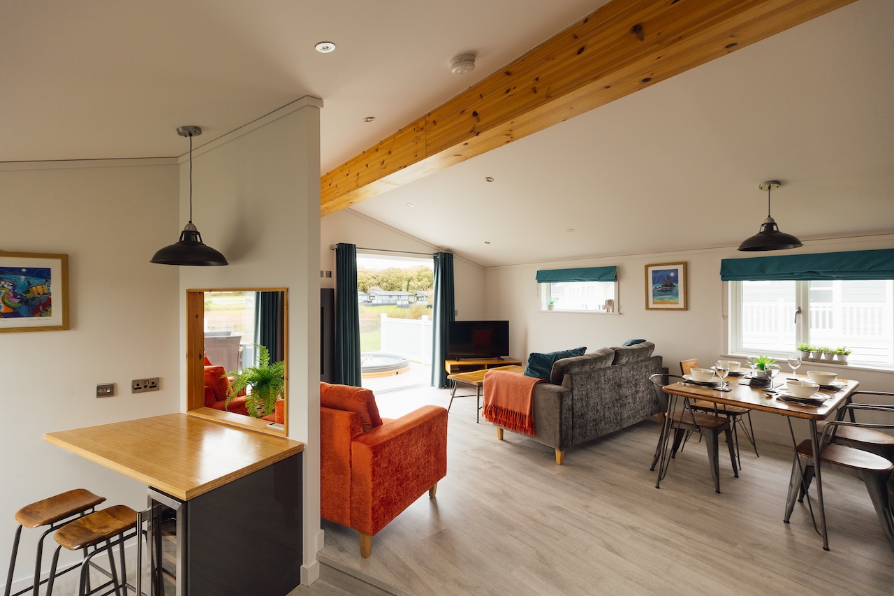 The lodge boasts a beautiful and contemporary open plan split level lounge/kitchen/dining area with vaulted ceilings and beautiful views onto the lake and golf course. Two sets of French doors leading onto the private spacious decking with sunken outdoor hot tub and elevated lakeside and golf course views.