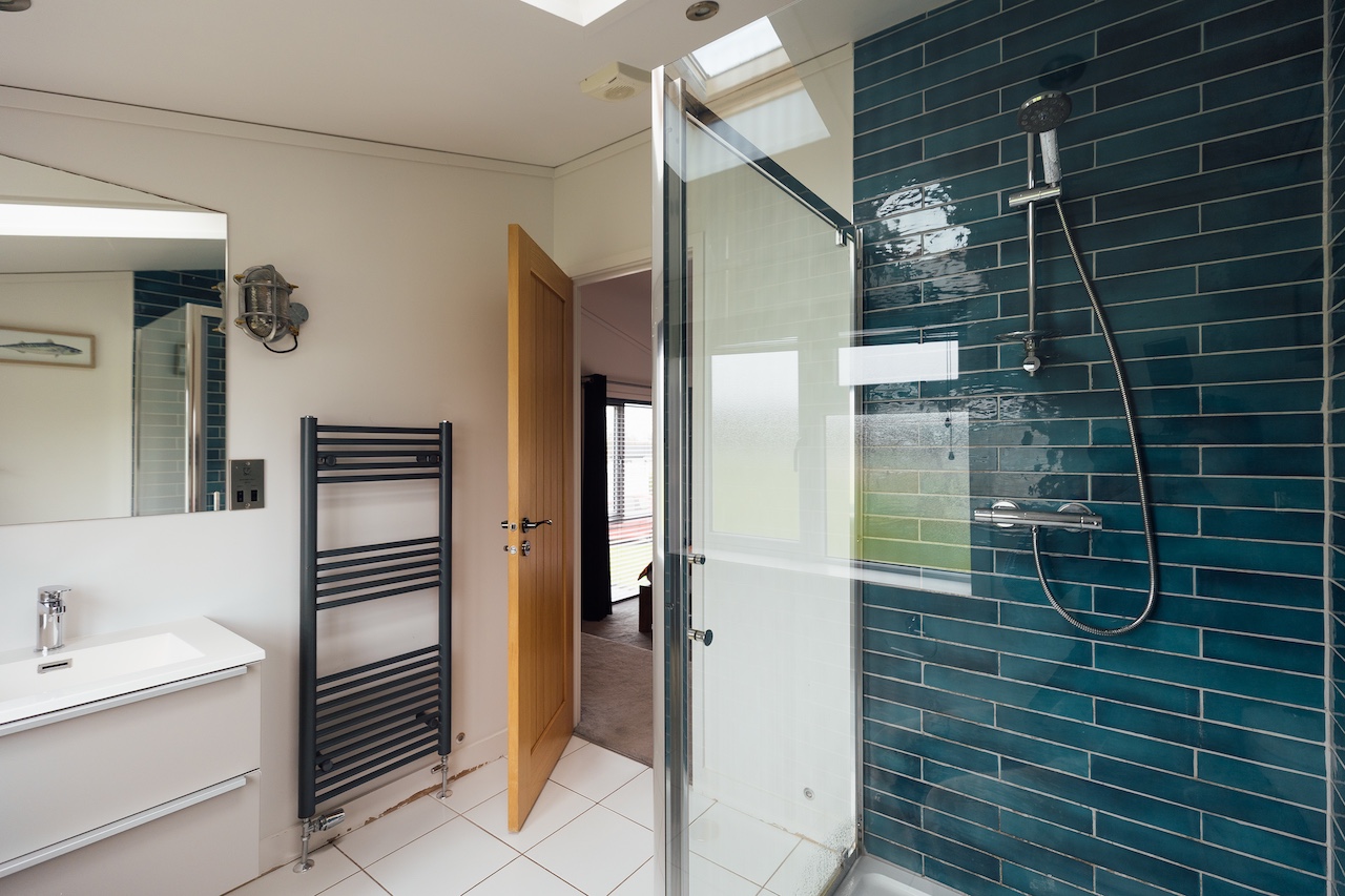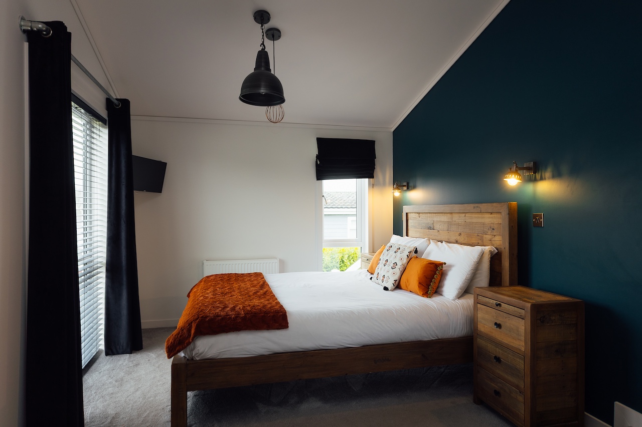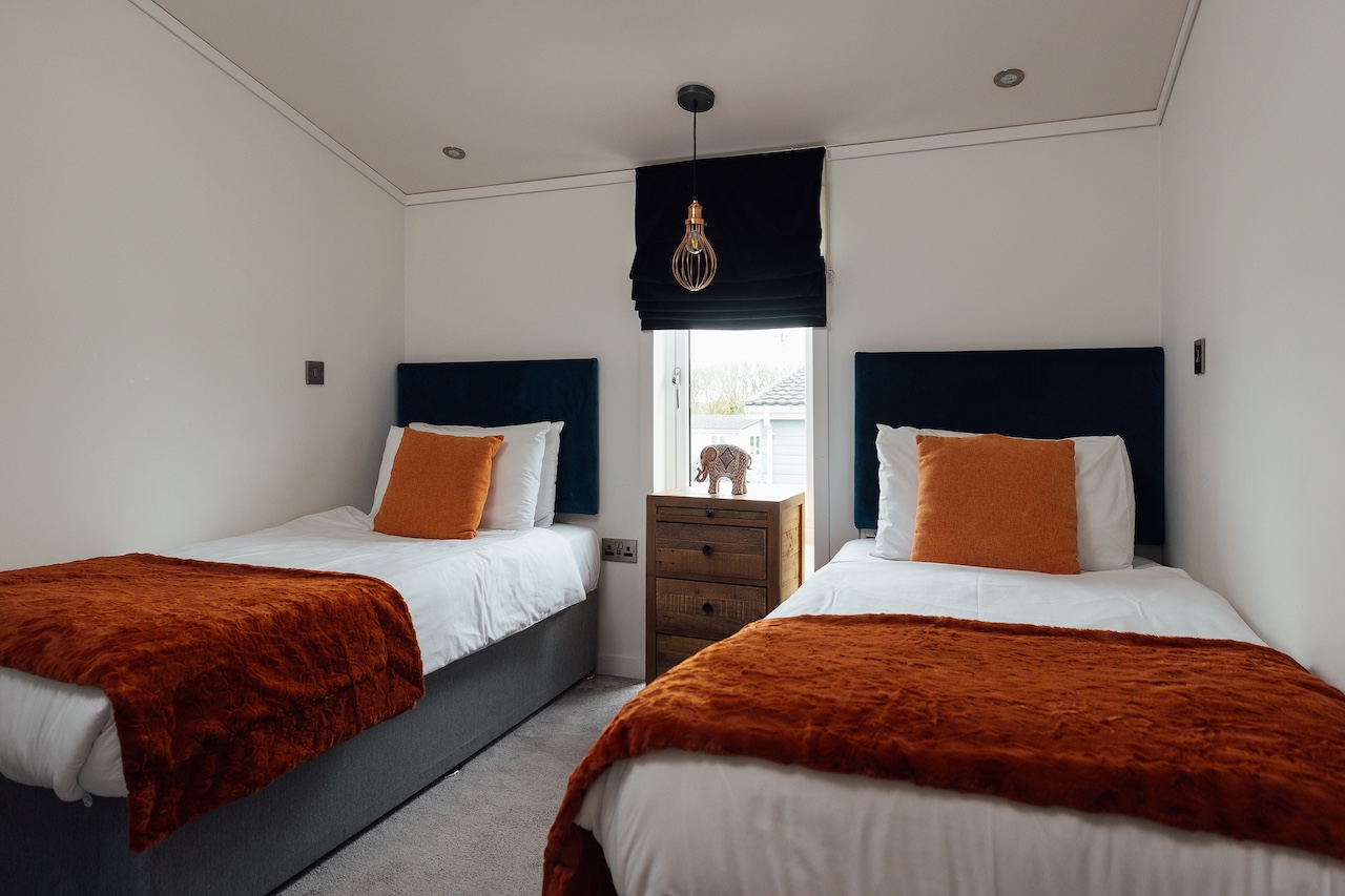 This stunning split level 2-bedroom lakeside luxury lodge has one king-size double bedroom with dressing room and en-suite shower, as well as a cosy twin bedroom. You'll also find a family bathroom with a gorgeous free-standing bath.
