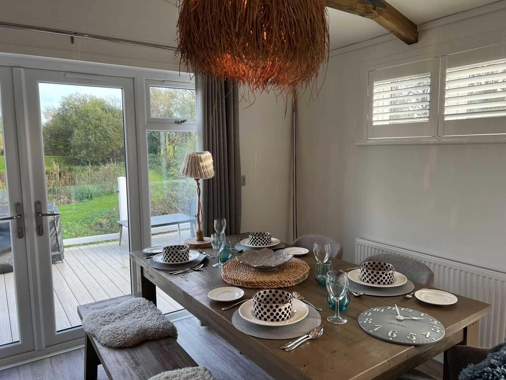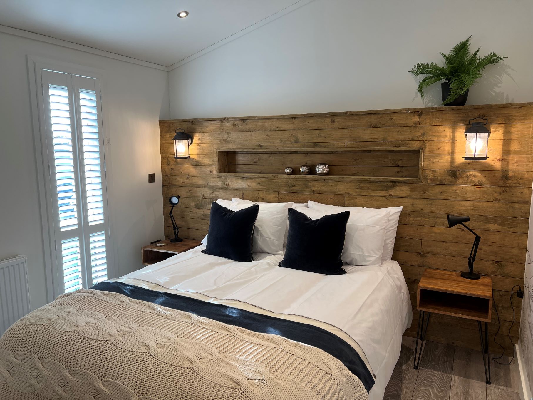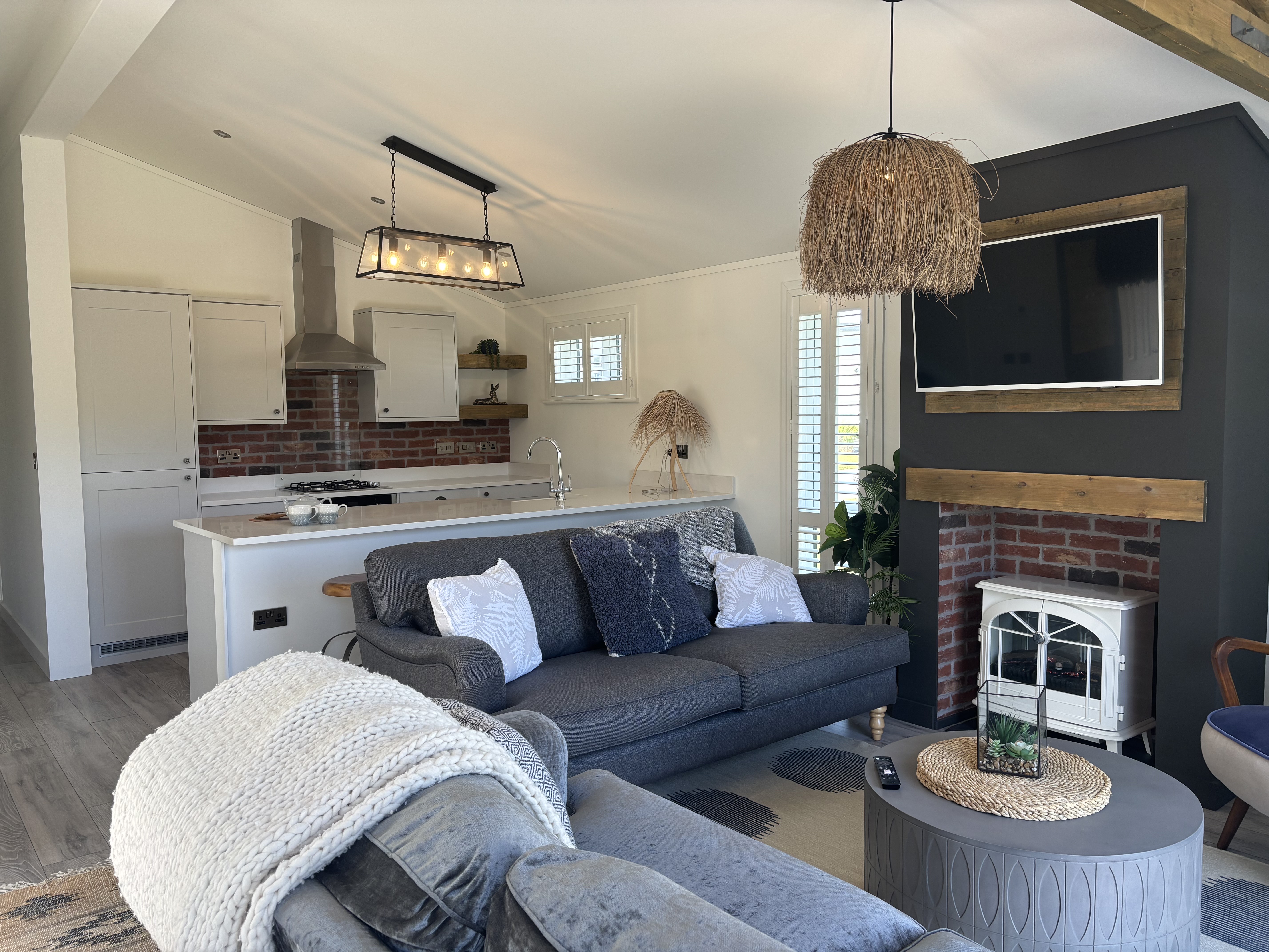 Featuring a stylish lounge/kitchen/dining area with vaulted ceilings and feature wooden A-frame beam, you'll also find two sets of French doors leading onto private spacious decking with sunken outdoor hot tub.